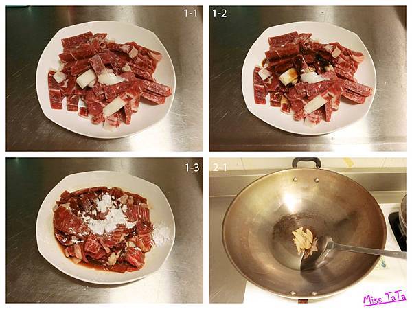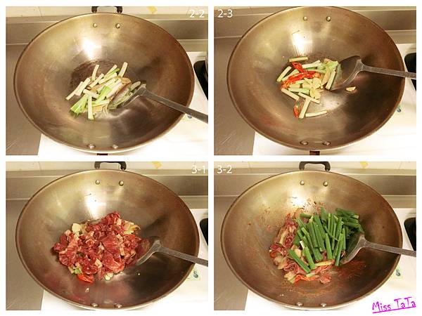 步驟2的爆香順序要稍加留意,因為蒜頭不耐炒且容易焦,薑又需要時間香氣才會引出,所以先將薑片與蔥白丟進鍋內爆香後,再放入蒜及辣椒,整體香氣與外觀較佳。另外,牛肉炒得過久會太老太硬,一定要抓準起鍋時間,當牛肉開始變色時就要趕快將其餘材料入鍋快速拌炒起鍋呈盤。塔塔在做這種熱炒類菜餚,大多會全程使用中大火,手腳要快,炒出來的料理才會鮮嫩多汁,色香味俱全,完全是外頭販賣的水準~