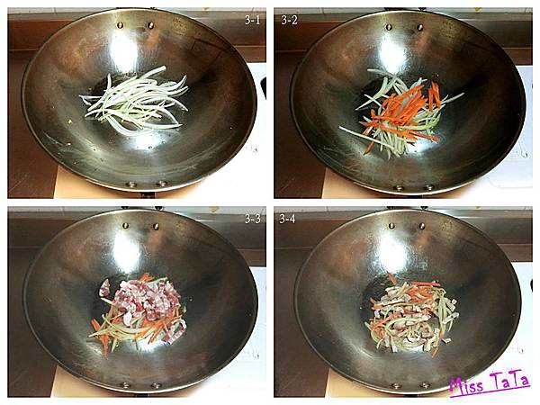 3.洋蔥和蘿蔔切絲放入鍋中炒至微微變色後,放入豬肉絲拌炒至熟。