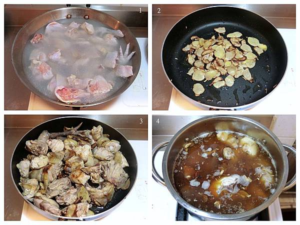 4. 炒到雞肉呈金黃色就可把麻油、米酒和水倒入燉煮約30~40分鐘即可完成。